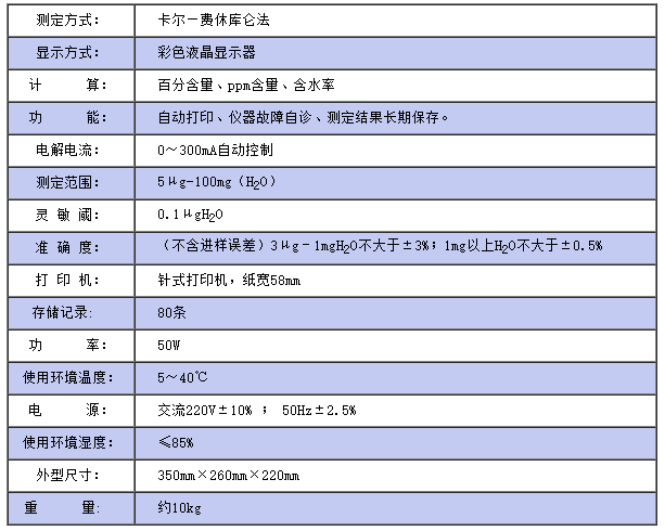 儀器符合GB/T7600及采用卡爾—費(fèi)休法測定樣品中水分的有關(guān)標(biāo)準(zhǔn),適用于石油化工產(chǎn)品、充油電器設(shè)備絕緣油及礦物原料等物質(zhì)中水分的測定。 該儀器采用了大屏幕彩色液晶顯示,中文菜單,人機(jī)對話更直觀,操作更簡便,具有自動(dòng)換算自動(dòng)打印和保存測定結(jié)果等功能,與同類儀器相比,大大提高了測試靈敏度。